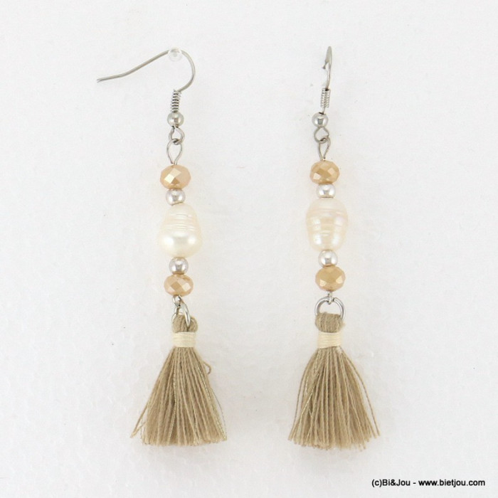Parissima vous présente ces boucles d'oreilles pendante perle eau douce pompon tassel tissu fermoir crochet 0317088 15x75 mm métal-polyester-cristal.