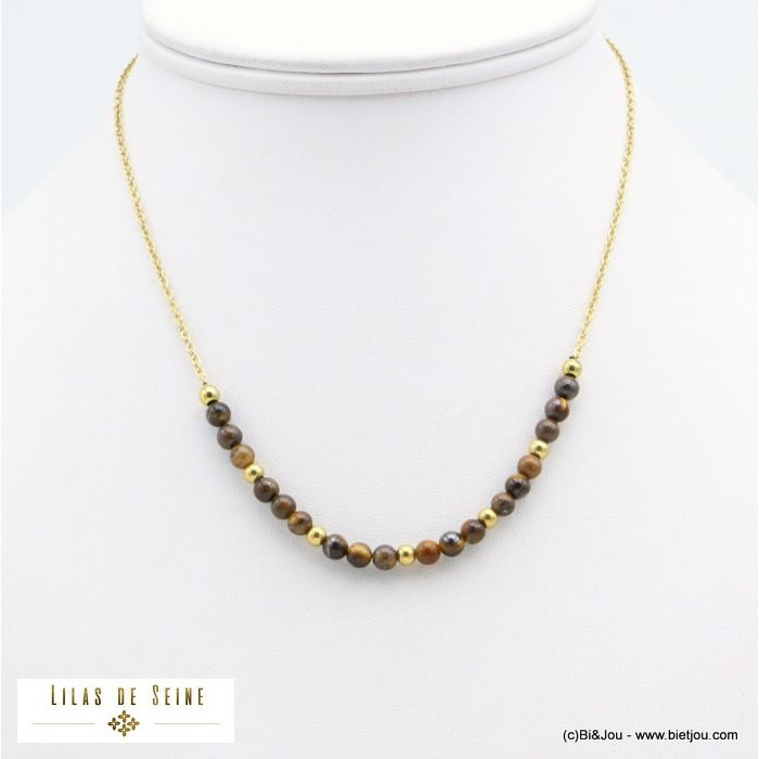 Parissima, grossiste bijoux fantaisie à Paris dans le quartier du Marais, vous présente ce collier de 40 cm avec des billes de 3 mm en pierre naturelle et une chaîne fine maille forçat en acier inoxydable pour femme 0121564.