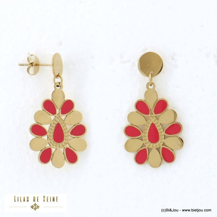 Parissima, grossiste bijoux fantaisie à Paris dans le quartier du Marais, vous présente ces boucles d'oreilles pendantes ovales en acier inoxydable avec des gouttes en résine époxy colorée pour femme 0322104.