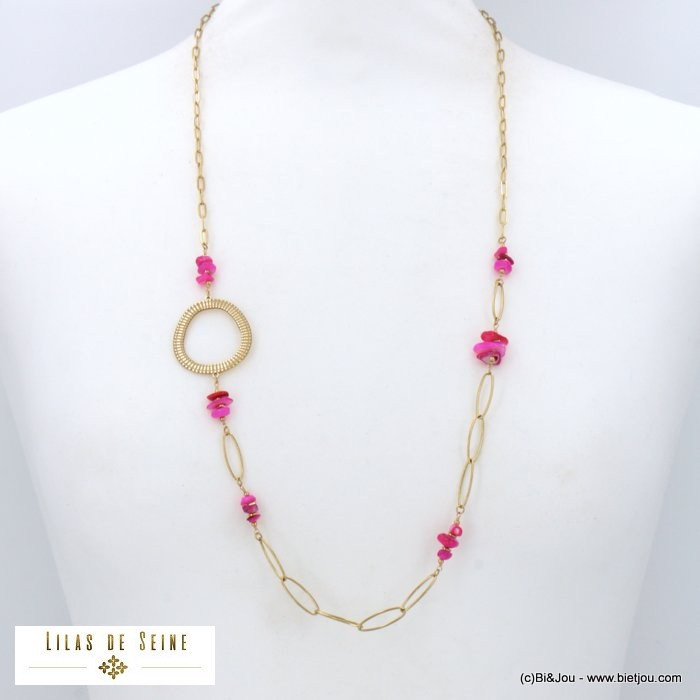 Parissima, grossiste bijoux fantaisie à Paris dans le quartier du Marais, vous présente ce sautoir en acier inoxydable avec un anneau asymétrique, des chips de pierre naturelle et chaine maille trombone pour femme 0122134.