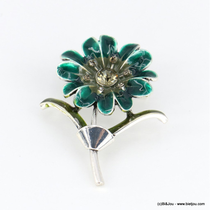 Parissima, grossiste de bijoux fantaisie à Paris dans le quartier du Marais, vous propose cette broche épingle en forme de fleur en métal, émail et strass coloré 0522505.