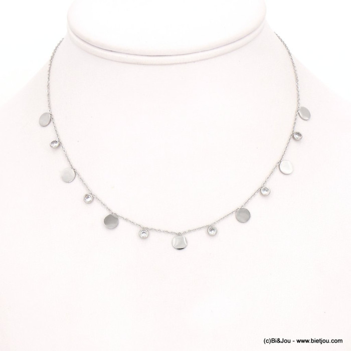 Parissima, grossiste bijoux fantaisie à Paris dans le quartier du Marais, vous présente ce collier en acier inoxydable avec des pampilles rondes et strass ainsi qu'une fine chaîne maille forçat pour femme 0123055.