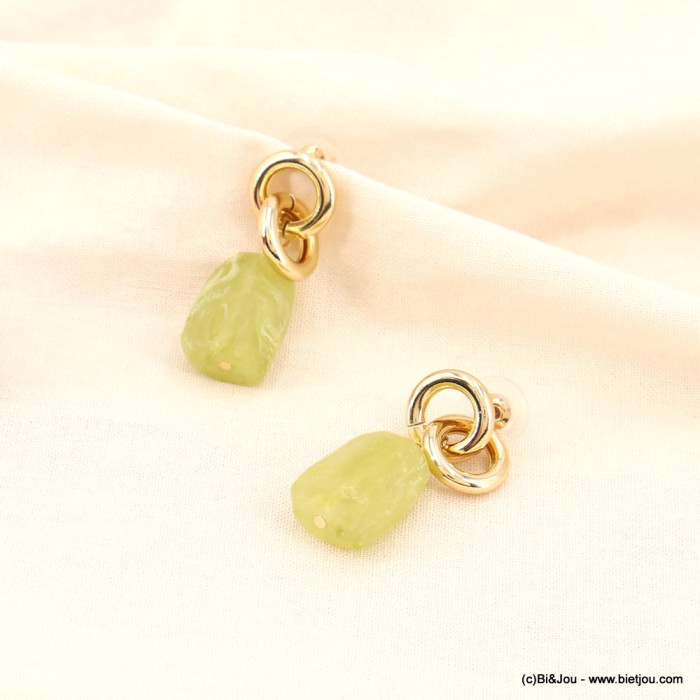 Parissima, grossiste de bijoux fantaisie à Paris dans le quartier du Marais, vous propose ces boucles d'oreilles vintage chic avec chaîne deux anneaux en métal doré et perles de résine effet marbré 0323108.
