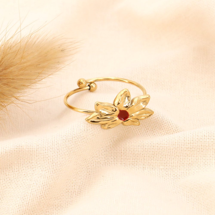 Parissima, grossiste de bijoux acier à Paris dans le quartier du Marais, vous présente cette bague fine ouverte et réglable en acier inox couleur doré avec une fleur de nénuphar en émail coloré pour femme 0423530.