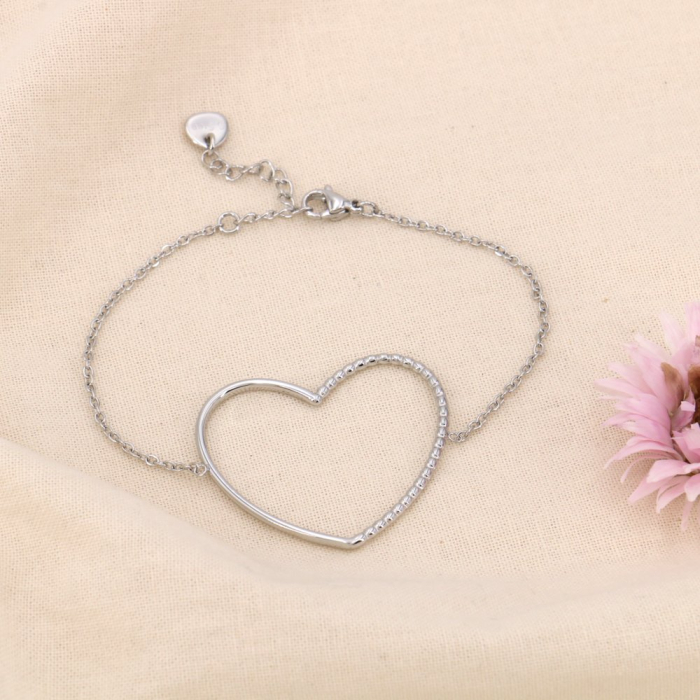 Parissima, fournisseur de bijoux en acier inoxydable à Paris dans le quartier du Marais, vous présente ce bracelet de style romantique en acier inoxydable avec un pendentif grand coeur et une fine chaîne maille forçat pour femme 0224025.