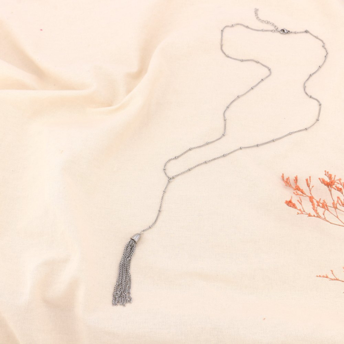 Le contraste entre la structure épurée de la chaîne et la fluidité du pompon crée une esthétique moderne, idéale pour enrichir une sélection de colliers sautoirs en acier inoxydable tendance.