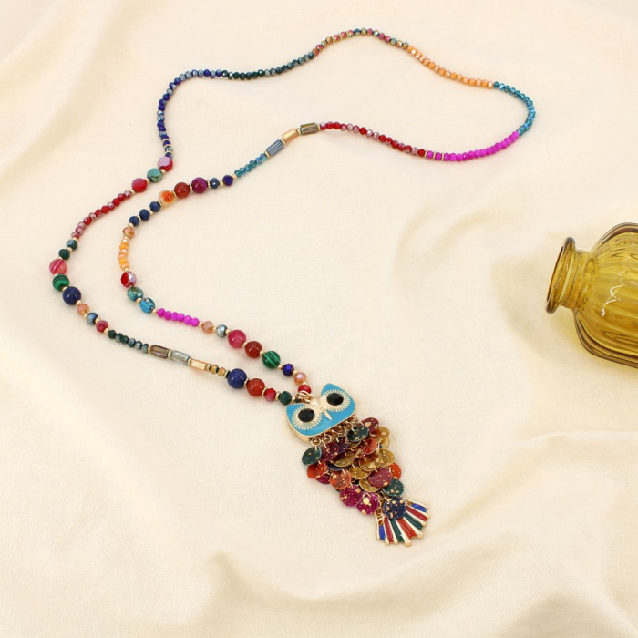 Sautoir perle cristal facettée pierre pendentif hibou métal 0124184 multi2