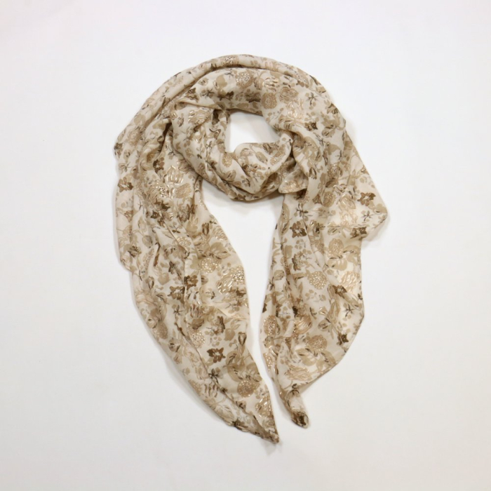 Ce foulard en voile de coton (20%) et viscose (80%), orné de motifs floraux délicats dans des nuances fraîches et des touches scintillantes dorées, est un choix parfait pour les détaillants et revendeurs souhaitant enrichir leur gamme d'accessoires de mode. Son design raffiné et sa texture légère en font un produit polyvalent, adapté à toutes les saisons et à une clientèle variée.