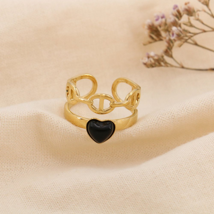 Ajoutez une touche d'élégance audacieuse à votre collection avec cette bague ajustable en acier inoxydable doré, au design unique à double-anneaux. L'association d'un motif chaîne marine ajourée et d'un cœur serti en pierre ou nacre (couleur blanche) naturelle en fait un bijou moderne et sophistiqué, idéal pour un style chic et affirmé.