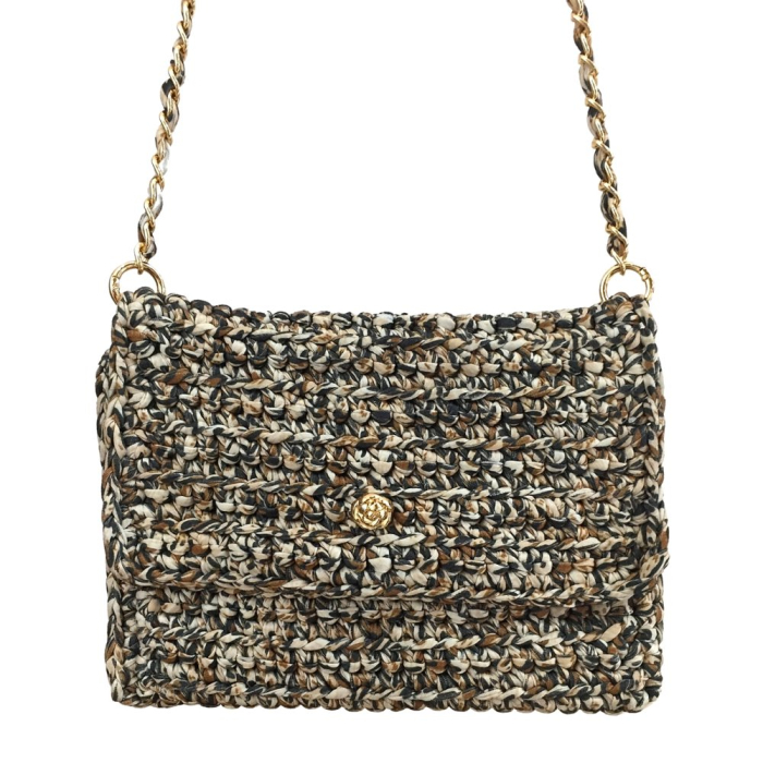 Avec ses dimensions compactes de 23 x 16 cm, ce modèle est idéal pour accompagner les tenues d’été tout en restant fonctionnel. Sa texture tressée et son motif multicolore ou cappuccino rappellent les accessoires artisanaux haut de gamme, tandis que sa chaîne dorée entrelacée de tissu ajoute une touche chic contemporaine.