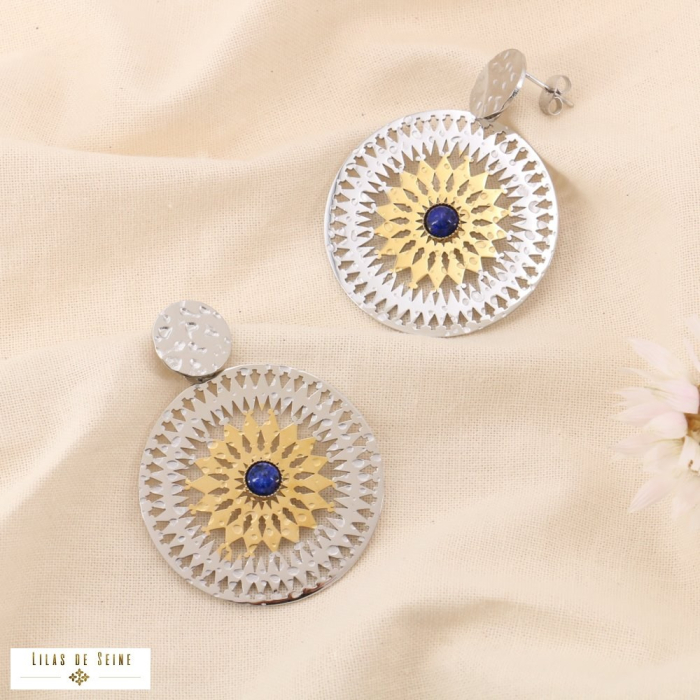 Ces boucles d’oreilles XXL en acier inoxydable captivent par leur design graphique inspiré des rosaces solaires. Un jeu de découpes précises et de volumes géométriques vient souligner un cabochon central en pierre naturelle, pour une touche minérale sophistiquée. Pensées pour les revendeurs professionnels, elles feront le bonheur des boutiques de prêt-à-porter, concept-stores ou instituts de beauté à la recherche de pièces affirmées et actuelles.