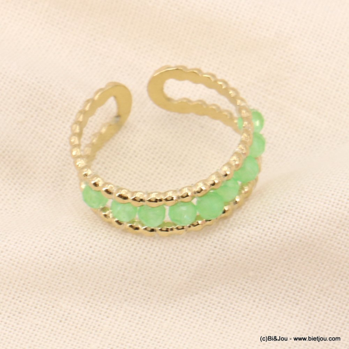 Graphique et lumineuse, cette bague ouverte en acier inoxydable doré séduit par sa structure double anneaux soulignée de billes en pierre naturelle. Délicate et tendance, elle s’ajuste facilement au doigt par simple pression, s’adaptant ainsi à toutes les morphologies avec élégance.