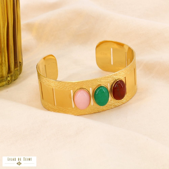 Offrez à vos clientes un bijou de caractère avec ce bracelet jonc large en acier inoxydable, orné de trois cabochons ovales en pierre naturelle. Ce modèle imposant, à la fois brut et raffiné, capte l’attention avec son relief texturé et ses pierres aux couleurs intenses.