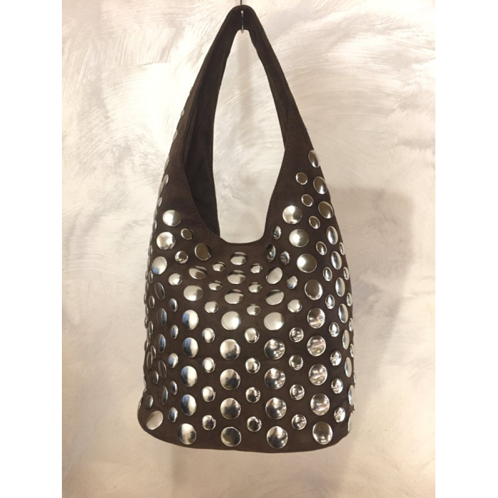 Sa silhouette souple et sa large anse en font un accessoire pratique et stylé, à porter facilement à l’épaule. Les finitions métalliques rondes confèrent à ce sac une personnalité affirmée, entre esprit bohème et modernité urbaine. Disponible en chocolat, taupe et camel, il s’adapte aisément aux tenues de saison et aux ambiances boutique raffinées.