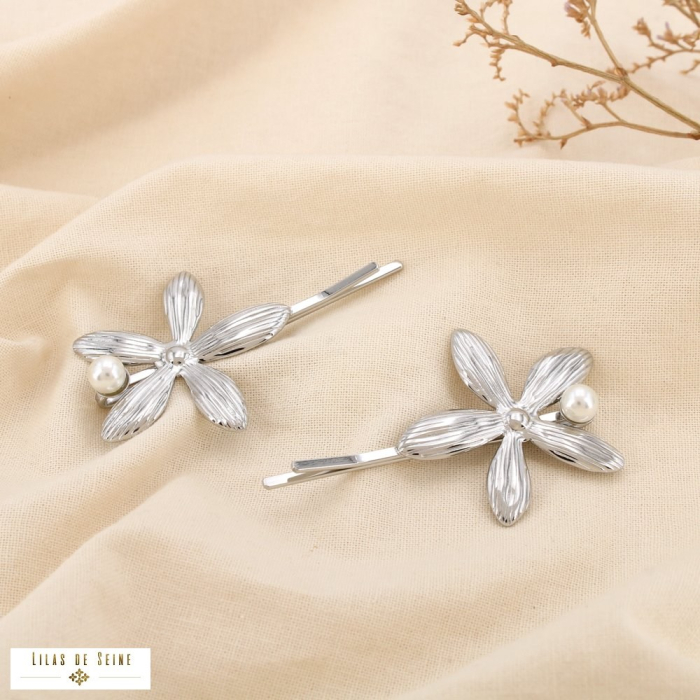Ce lot de 2 barrettes cheveux en acier inoxydable est sublimé par un motif floral élégant agrémenté de perles acryliques. Déclinées en finition dorée ou argentée selon les modèles, ces barrettes apportent une touche féminine et raffinée aux coiffures du quotidien comme aux looks plus habillés. Leurs dimensions d’environ 30 x 70 mm assurent un maintien efficace tout en restant visuellement équilibrées.