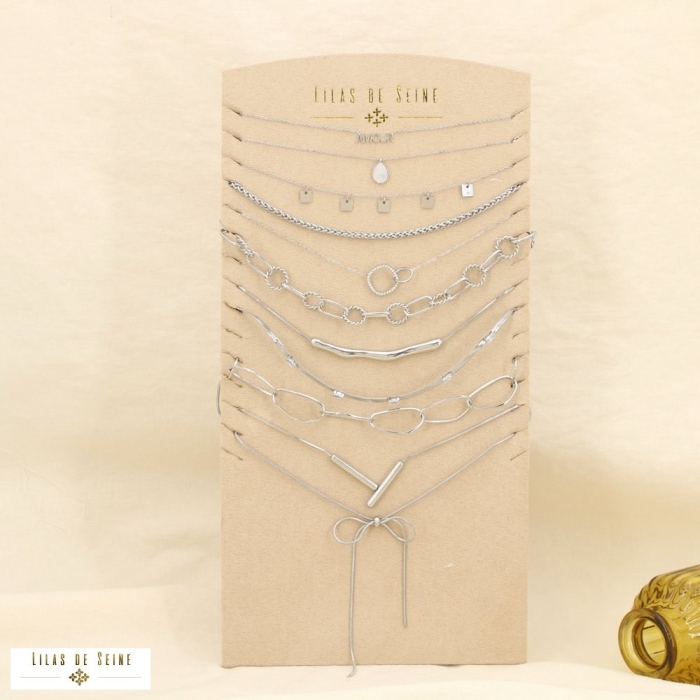 Cet assortiment permet de proposer plusieurs styles au sein d’un même produit, répondant ainsi à une clientèle finale aux goûts variés. Le support en tissu nubuck inclus facilite une mise en place immédiate en boutique, tout en valorisant chaque collier de manière claire et ordonnée.