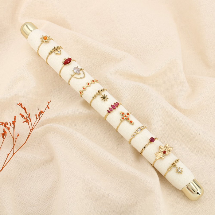 L’ensemble est livré sur un présentoir cylindrique crème et doré, pensé pour valoriser immédiatement les bagues en vitrine ou sur comptoir. Cette présentation soignée favorise l’achat d’impulsion et simplifie la mise en rayon, sans nécessiter d’accessoires supplémentaires.