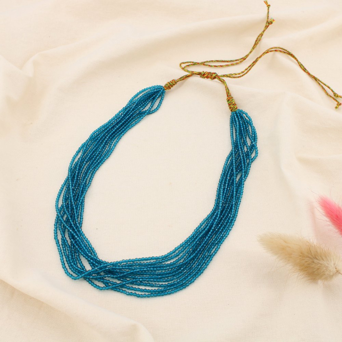 Ce collier en cristal monté sur cordon coulissant séduit par son esthétique artisanale et son rendu lumineux. Composé de multiples rangs de perles facettées en cristal, il offre un jeu de reflets élégant, parfaitement adapté aux collections de bijoux fantaisie à forte valeur perçue.