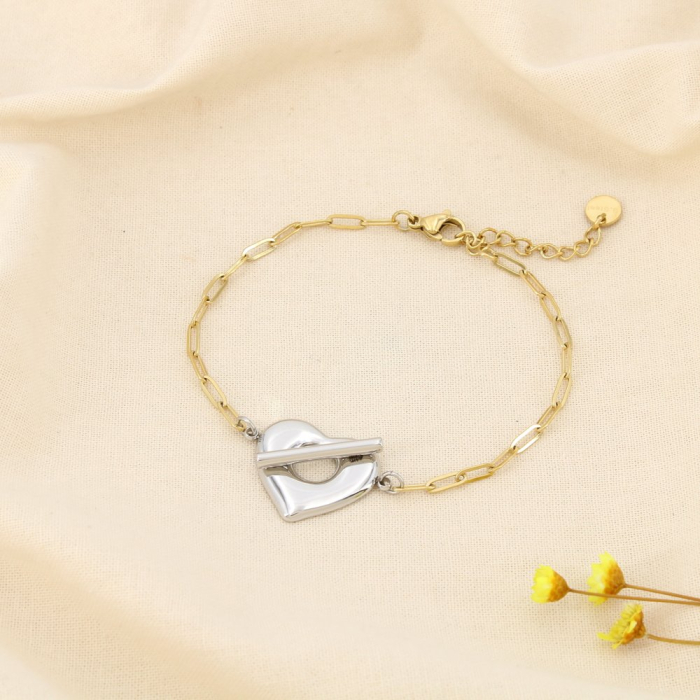 À la fois moderne et symbolique, ce bracelet en acier inoxydable bicolore doré et argenté s’impose comme une pièce forte au design actuel. Pensé pour une clientèle féminine sensible aux bijoux tendance et faciles à porter, il associe une maille contemporaine à un pendentif cœur graphique.