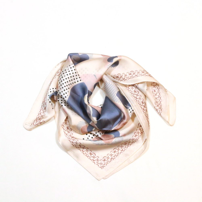 Ce carré satin se porte aussi bien autour du cou, dans les cheveux, noué à un sac ou en accessoire de poignet. Ses teintes douces et naturelles – rose nude et vert – facilitent son intégration dans des univers variés, du prêt-à-porter féminin chic aux concepts plus créatifs et lifestyle.