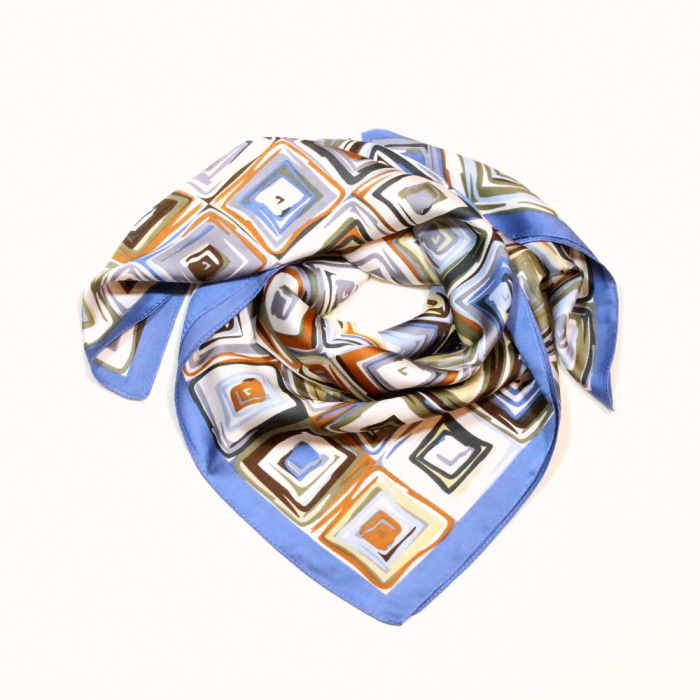 Grâce à ses teintes sobres et contemporaines, ce carré satin s’intègre facilement dans des collections féminines chic, casual ou créatives. Le fond bleu apporte une touche graphique affirmée, tandis que le taupe séduit par sa neutralité élégante, idéale pour une clientèle en quête d’accessoires faciles à porter au quotidien.