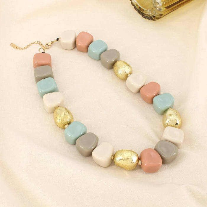 Ce collier fantaisie pour femme séduit par son design graphique et contemporain, composé d’une alternance harmonieuse de cubes en résine acétate multicolore et d’éléments dorés texturés. Inspiré par une esthétique à la fois moderne et douce, il associe des tons poudrés (rose nude, écru, gris, vert d’eau) à des accents dorés lumineux, créant un bijou à fort impact visuel, idéal pour dynamiser une tenue.