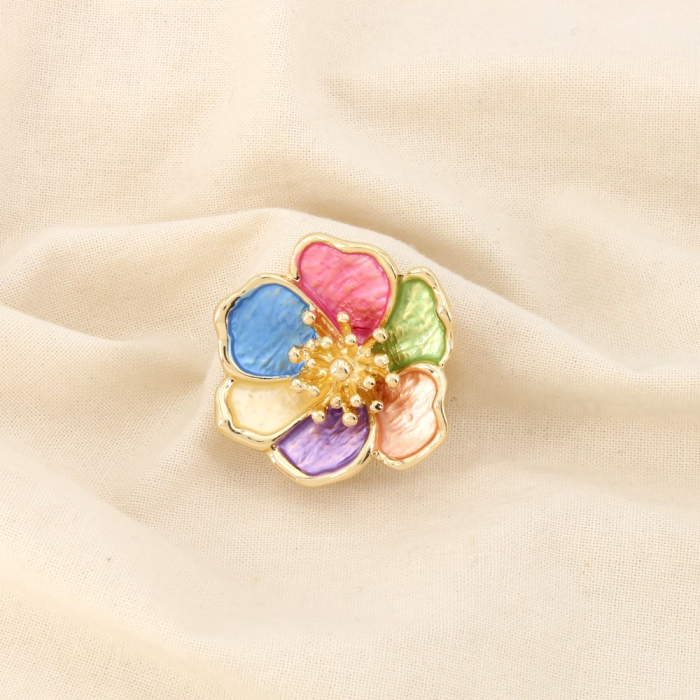 Cette broche aimantée en métal émaillé séduit par son motif floral délicat et son format compact, parfaitement adapté aux accessoires mode du quotidien. Les pétales finement travaillés, aux finitions légèrement nacrées, apportent profondeur et luminosité, tandis que le cœur en relief souligne le savoir-faire décoratif de cette pièce. Son design élégant et équilibré s’intègre aisément dans une sélection d’accessoires féminins à l’esthétique soignée.