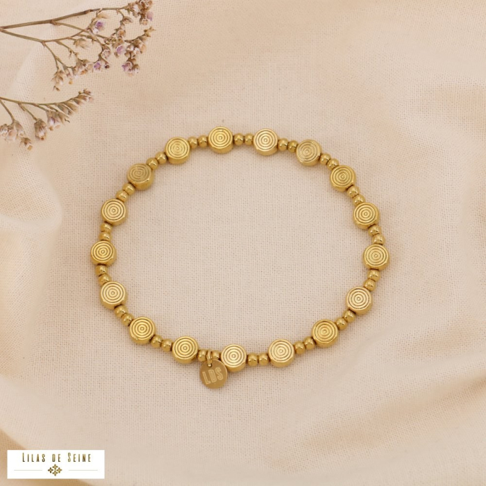 Ce bracelet se compose d’une alternance harmonieuse de perles rondes lisses et de disques plats gravés d’un motif spirale. La répétition du motif circulaire crée un effet graphique captivant, tout en conservant une ligne épurée et moderne.