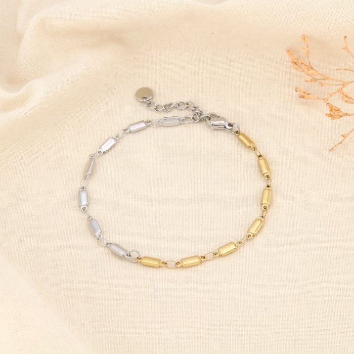 Ce bracelet chaîne à maillons rectangulaires alterne subtilement finitions dorée et argentée, offrant un effet bicolore moderne particulièrement apprécié pour le mix & match. Chaque maillon mesure environ 3 x 9 mm, créant un rythme visuel structuré, à la fois minimaliste et affirmé.