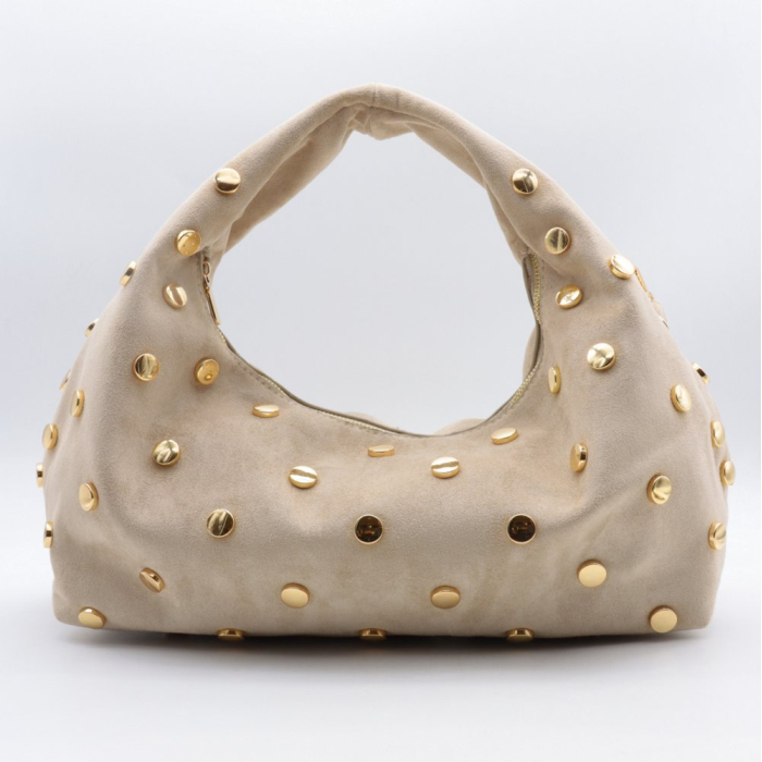 Les clous dorés contrastant avec la matière douce effet daim créent un équilibre entre féminité et caractère. Ce positionnement rock chic séduit une clientèle urbaine recherchant un accessoire mode fort, capable de transformer une tenue simple en look affirmé.