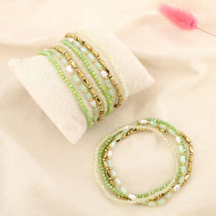 Les bracelets fins à perles et cristaux sont au cœur des tendances mode, notamment grâce à la popularité du mix & match et de l’accumulation de bijoux. Les nuances de vert apportent une touche fraîche et naturelle qui s’accorde parfaitement avec les collections printemps-été.