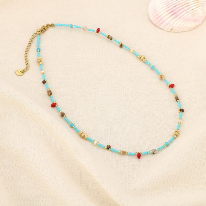 Apportez une touche de fraîcheur et de raffinement à votre sélection avec ce collier en acier inoxydable orné de perles de cristal, de rocailles et de pierres naturelles. Son design délicat, rythmé par des nuances turquoise ponctuées de touches colorées et dorées, s’inscrit parfaitement dans les tendances actuelles inspirées de l’univers balnéaire et bohème chic.