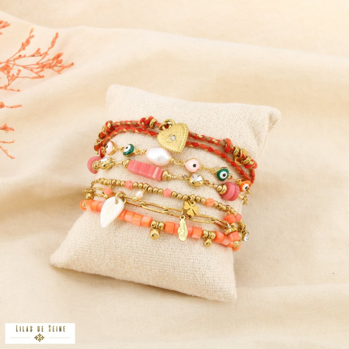 Enrichissez votre offre avec cet ensemble de 6 bracelets en acier inoxydable, combinant avec subtilité pierres, nacre, perles d’eau douce, strass, cordons tressés et éléments en émail. Ce mix de matières et de textures crée un produit à forte valeur perçue, idéal pour capter l’attention en point de vente.