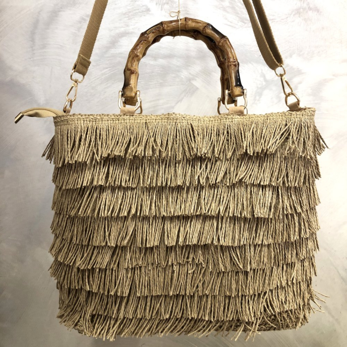 Ce sac se distingue par ses superpositions de franges qui créent du mouvement et du relief, pour un rendu très tendance. Son anse rigide effet bambou renforce son inspiration artisanale, tandis que sa large bandoulière textile apporte confort et modernité.