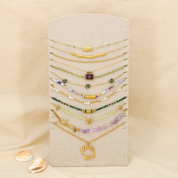 Apportez de la diversité et de la modernité à votre offre avec cet ensemble de 12 colliers en acier inoxydable, alliant subtilement pierres, éléments en coton et polyester, émail et perles acryliques. Cet assortiment propose une variété de styles harmonieux, mêlant inspirations naturelles et détails contemporains, parfaitement adaptés aux attentes actuelles du marché.