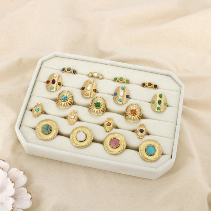 Ce lot propose une grande diversité de modèles : bagues larges texturées, designs ajourés, motifs soleil et pièces ornées de cabochons colorés. La présence de nacre et de pierres apporte luminosité et relief, favorisant une mise en valeur attractive en vitrine.
